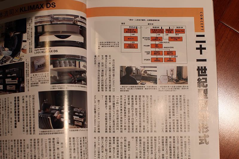 1) connection (wired) : NAS ----> Wireless Router ----> Linn DS ----> Pre amp ----> Power amp ----> speakers
