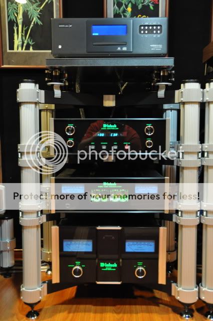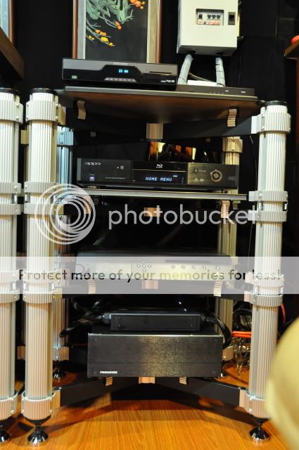 มาดูชั้น SolidTech แถวที่ 1 ที่ประกอบไปด้วย SACD+DAC EMMLabs (ตัวนี้ HP/Absolute Sound เล่มใหม่เพิ่งลงให้เป็น Golden Ears Award ซะด้วย (อยู่บนแท่น Symposium ซึ่งวางอยู่บน Feet of Silence ที่เป็น Rubber Damper) Pre Mc C500T และ Power Mc402 สำหรับเซอร์ราวน์ดหลัง
