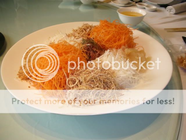 จานแรกเป็นอาหารพิเศษประจำเทศกาลตรุษจีน เพื่อความเจริญรุ่งเรื่องของกิจการร้านค้าและความสามัคคีของผู้บริหารหรือหุ้นส่วนเจ้าของกิจการ ทำจากแครอท เผือก ไชเท้า มันฝรั่ง หอมแดง มีฝักทองทอดและถั่วบดโรยด้านบน ใส่เนื้อปลาแซลมอนลงไป ราดด้วยน้ำมันงา น้ำผึ้ง เสร็จแล้วให้ผู้ร่วมโต๊ะใชตะเกียบไม้ยาวๆ ช่วยกันคลุกเคล้าให้ส่วนผสมทั้งหมดเข้ากัน (เหมือนกับการช่วยลงแขก จะได้มีความสามัคคีกัน) แต่พอทานแล้วก็ไม่ได้อร่อยอะไรออกหวานๆ ส้มตำเราอร่อยกว่าเยอะ อิอิ