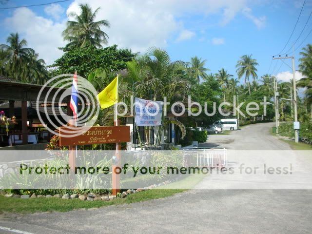 รูปทางเข้ารีสอร์ทสวนบ้านกรูด ด้านหลังกล้องเป็นชายทะเล หน้ารีสอร์ทเป็นถนนขั้นระหว่างชายหาดกับตัวบ้านพัก