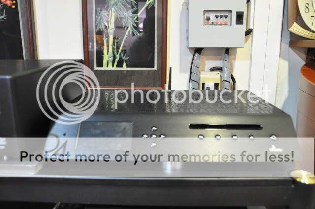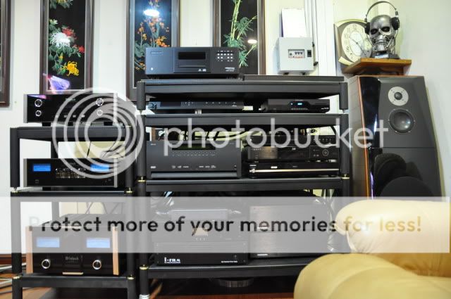 - ชุดสุดท้ายทางด้านขวามือจากบนลงล่าง ตัวบนคือ แท่น Symposium รุ่น Svelte Plus แบบหนา เตรียมไว้สำหรับเอาที่เล่นแผ่นเสียงตัวใหม่ซึ่งยังอยู่ในกล่อง คือ VPI Classic + JMP 10.5 tonearm + Dynavector MC cartridge เครื่องถัดลงมาคือ Sattelite HD Receiver Box w HDMI output ของ SMART (Germany) ต่อลงมาคือ HD Media Player DUNE HD Base 3.0 วางอยู่บน BD Player OPPO BD83 w SDI ซึ่งอยู่บน HDDVD Toshiba EX1S สุดท้ายล่างสุดคือขุมจ่ายพลังของ AV Paradise รุ่น Signature 2 ชุด