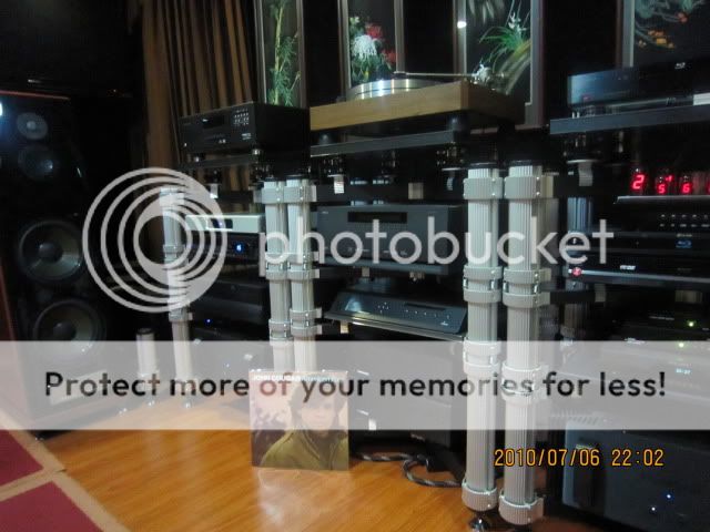 รูปนี้เอาให้ครบสูตร ตั้งแต่ ชั้นวางเครื่องเสียง Rack of Silence ไปจนถึงเครื่องเล่น SACD EMM LAbs XDS 1 ที่อยู่บนสุด ส่วนล่างสุดคือ poweramp Plinius SA103 ที่ผมใช้ขับลำโพง surround Be10 อยู่