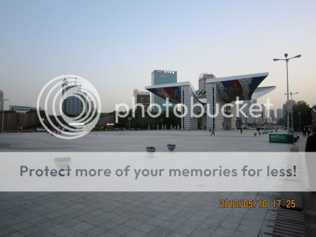 บริเวณลานหน้าทางเข้าสนามกีฬาโอลิมปิค ด้านหลังเป็นประตูชัย สัญญลักษณ์กีฬาโอลิมปิคที่เกาหลีใต้