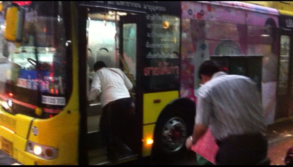 เห็นรถเมล์ผ่านมา แอบโบกมือเรียกคนขับให้เปิดประตู แล้วก็วิ่งขึ้นรถไปเลย  ;D