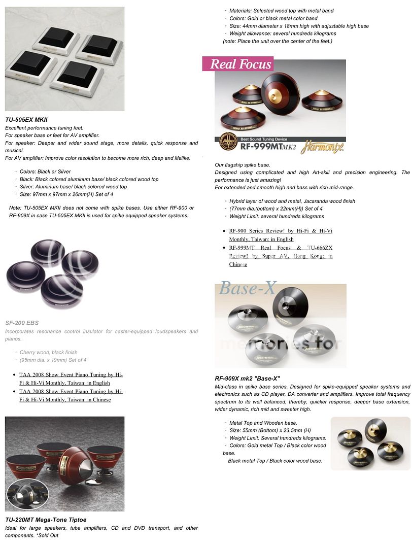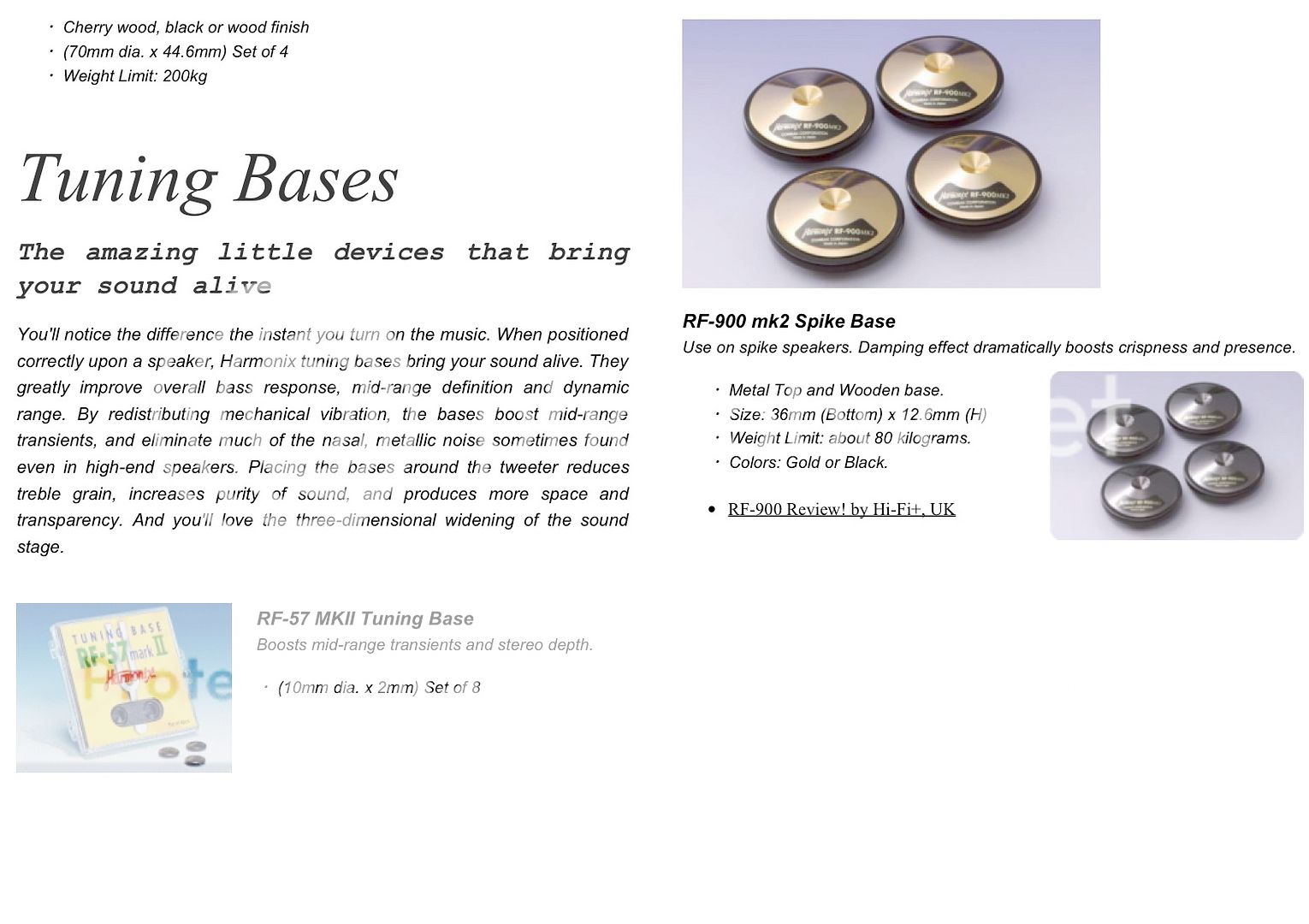 ที่รองสไปค์ HARMONIX TUNING รุ่นยอดนิยม RF-900 ผลิตจากโลหะผสม ( Hybrid Metal ) เอกสิทธิเฉพาะ HARMONIX ทันทีที่ใช้รองลำโพงหรือเครื่องเสียง จะทำให้นำ้เสียงมีความหนักแน่น กระฉับกระเฉง มีรายละเอียดมากขึ้น RF-900 ออกแบบและผลิตในประเทศญี่ปุ่น 100%