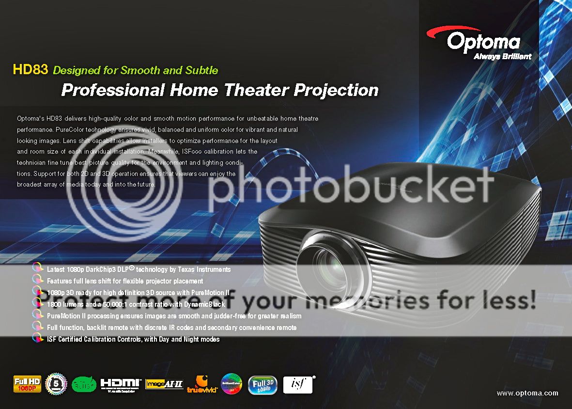 OPTOMA ......" THE WORLD'S BEST DLP PROJECTOR " รุ่น HD- 83 หรือ รุ่น HD-8300ในตลาดอเมริกา.......***** ราคา 185,000 บาท***** ครับ....... ไม่ควรพลาดสำหรับทุกท่านที่ชื่นชอบ DLP TECHNOLOGIES ที่ให้ความคมชัดสูงสุด เมื่อเที่ยบกับระบบอื่นๆ ........ ให้ภาพดีที่สุด 1080p ทั้งในระบบ 2D และ 3D.......