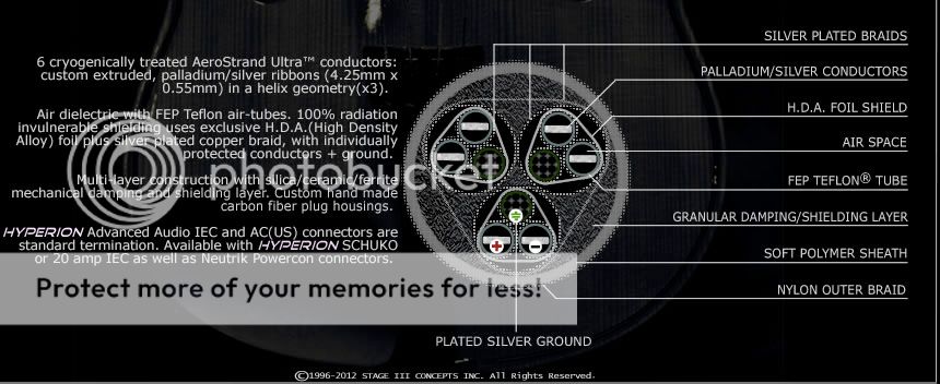 Multi-layer construction with silica/ceramic/ferrite mechanical damping layer. Custom handmade polymer-filled, carbon fiber plug housings help eliminate external vibrations. Exclusive Hyperion Ceramic plugs with Silver/Copper alloy electrical contacts, Palladium plated and Cryo-treated (custom made by Stage III Concepts).